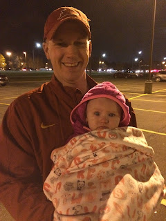 Doesn't she look thrilled for the chilly walk across the parking lot?